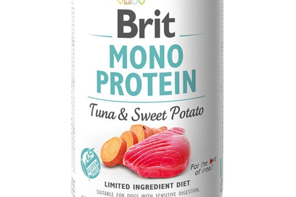 BRIT Mono Protein, Ton cu Cartof dulce, conservă hrană umedă monoproteică fără cereale câini, (pate), 400g