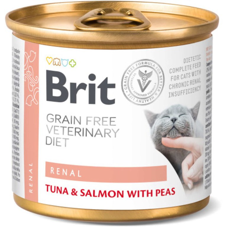 BRIT VD Renal, Ton și Somon, dietă veterinară, conservă hrană umedă fără cereale pisici, sistem renal, (în aspic), 200g