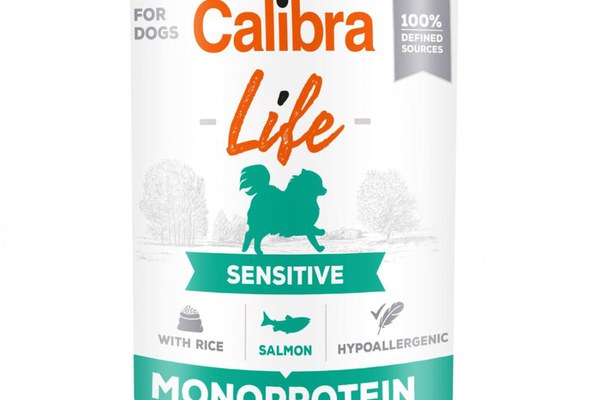 CALIBRA Life Sensitive, XS-XL, Somon și Orez, conservă hrană umedă monoproteică fără cereale câini, sistem digestiv, (pate), 400g