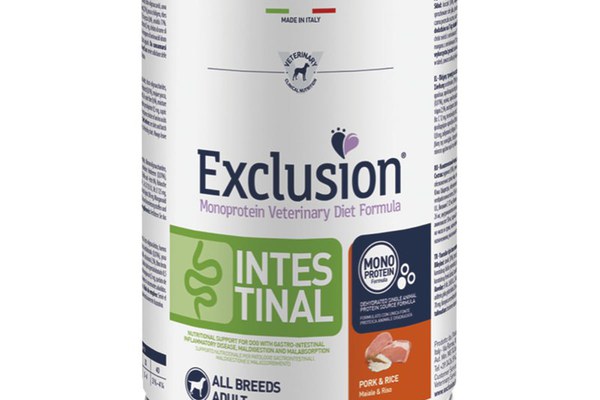 EXCLUSION Monoprotein VD Intestinal, XS-XL, Porc și Orez, dietă veterinară, conservă hrană umedă fără cereale câini, sistem digestiv, (pate), 400g