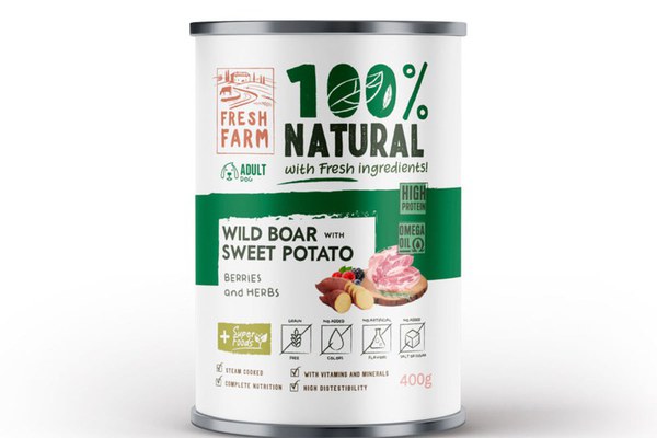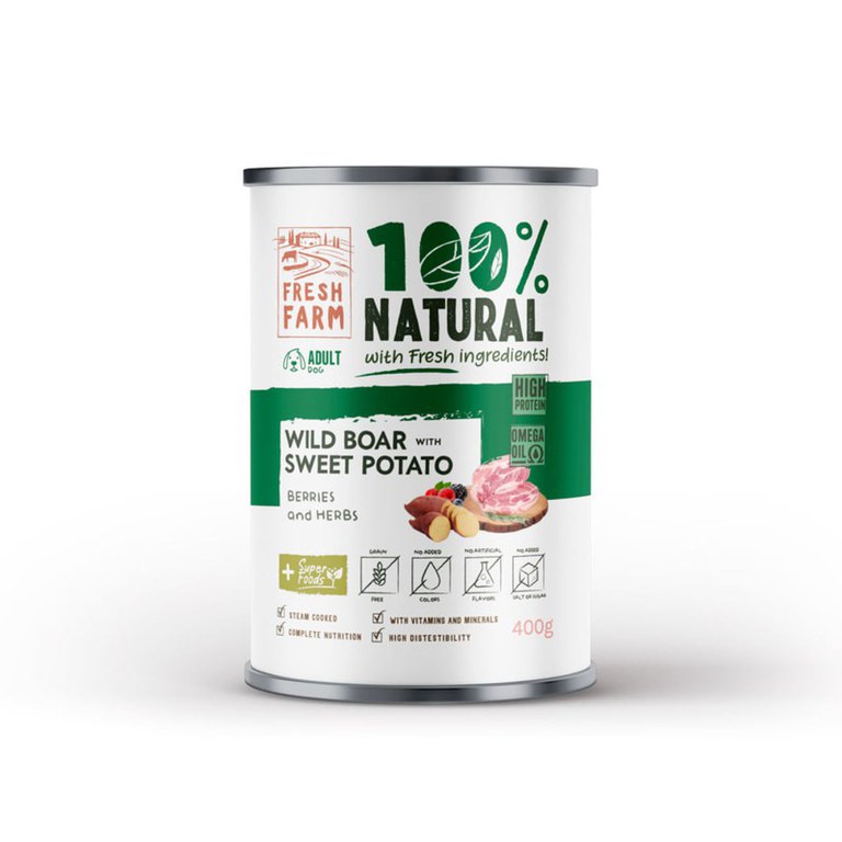 FRESH FARM Coarse, XS-XL, Mistreț și Cartof Dulce, conservă hrană umedă fără cereale câini, (pate), 400g