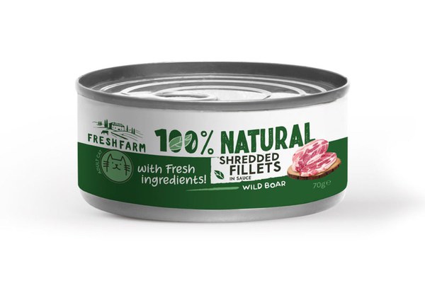 FRESH FARM Schredded fillets, Mistreț și Pui, conservă hrană umedă fără cereale pisici, (în sos), 70g