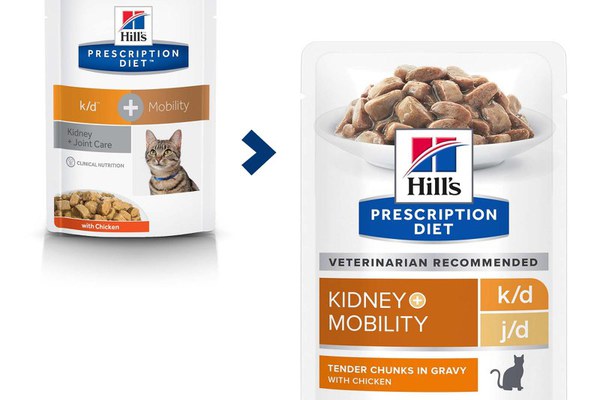 HILL'S Prescription Diet k/d+j/d Kidney Care + Mobility, Pui, dietă veterinară pisici, plic hrană umedă, sistem renal, sistem articular, 85g x 12buc