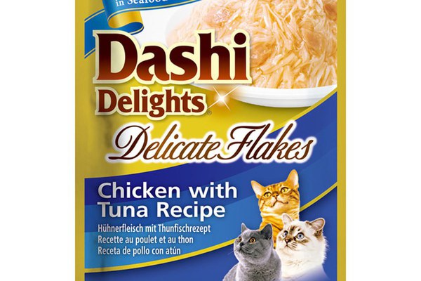 INABA Churu Dashi Delights Delicate Flakes, Pui și Ton, plic hrană umedă fără cereale pisici, (topping), 40g
