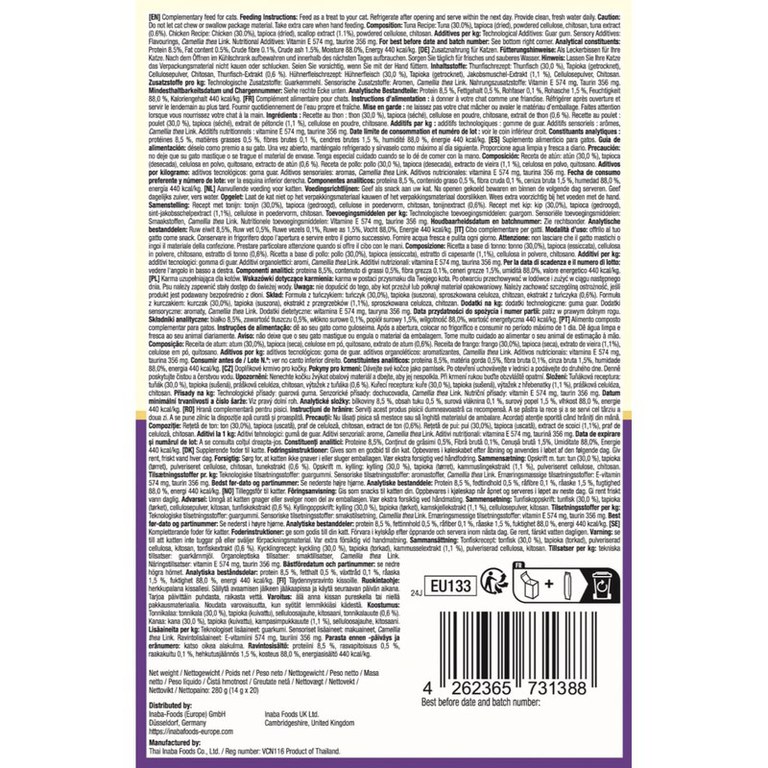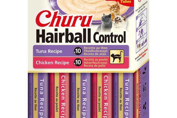 INABA Churu Hairball Control Varieties, Pui și Ton, cutie recompense fără cereale pisici, limitarea ghemurilor de blană, (piure), 280g