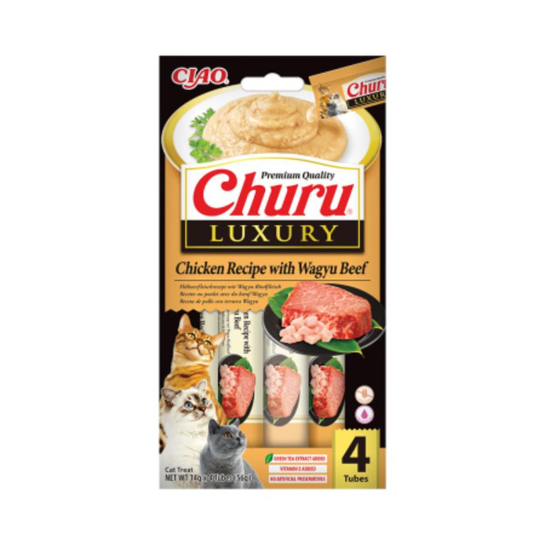 INABA Churu Luxury, Ton și Vită Wagyu, plic recompense fără cereale pisici, (piure), 56g