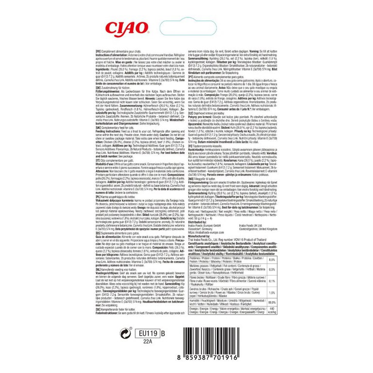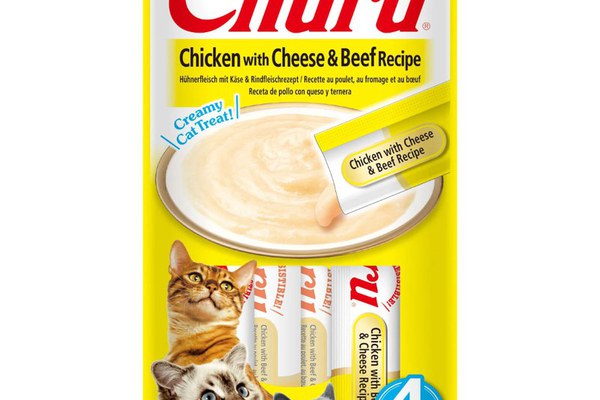 INABA Churu Pui, Brânză și Vită, plic, tub recompense fără cereale pisici, (piure), 56g