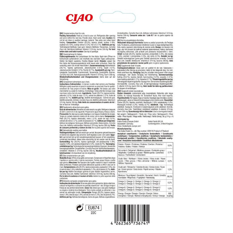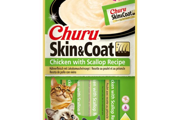INABA Churu Skin & Coat, Pui și Scoici, plic, tub recompense fără cereale pisici, piele & blană, (piure), 56g