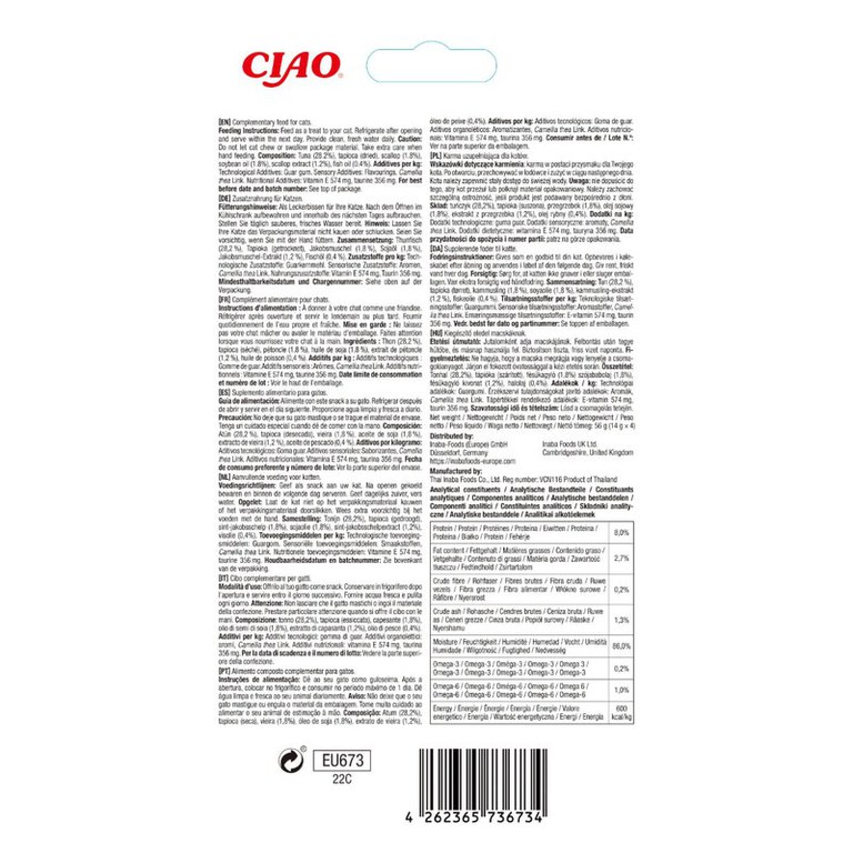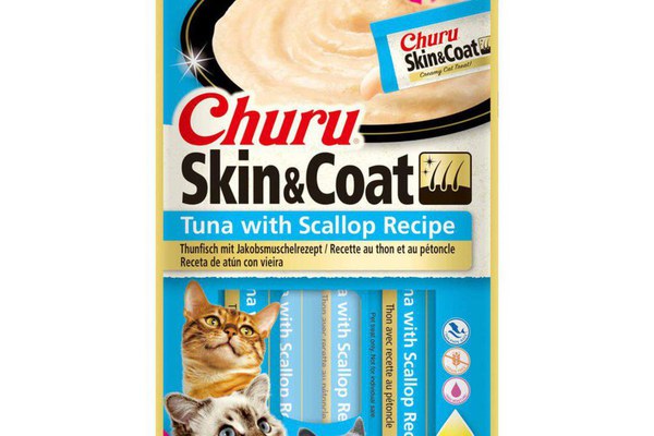 INABA Churu Skin & Coat, Ton și Scoici, plic, tub recompense fără cereale pisici, piele & blană, (piure), 56g