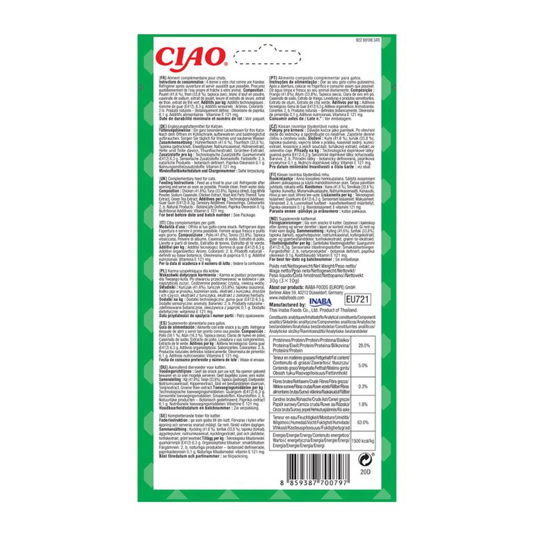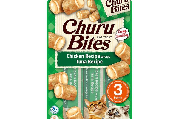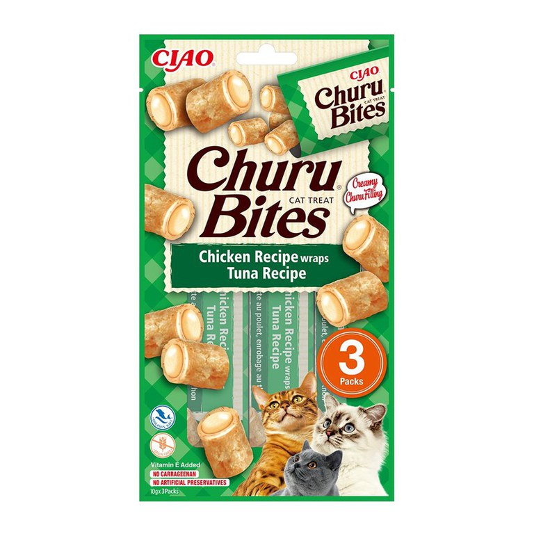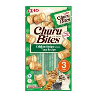INABA CIAO Churu Bites, Pui și Ton, recompense fără cereale pisici, pernute umplute, 10g x 3