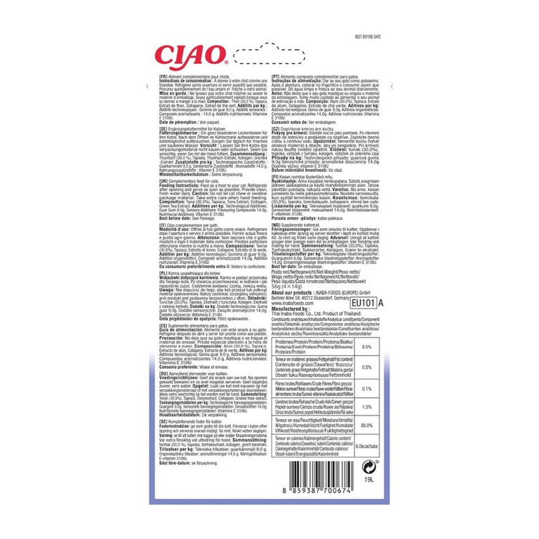 INABA CIAO Churu Piure, Ton, recompense lichide monoproteice fără cereale pisici, topping cremos, 14g x 4