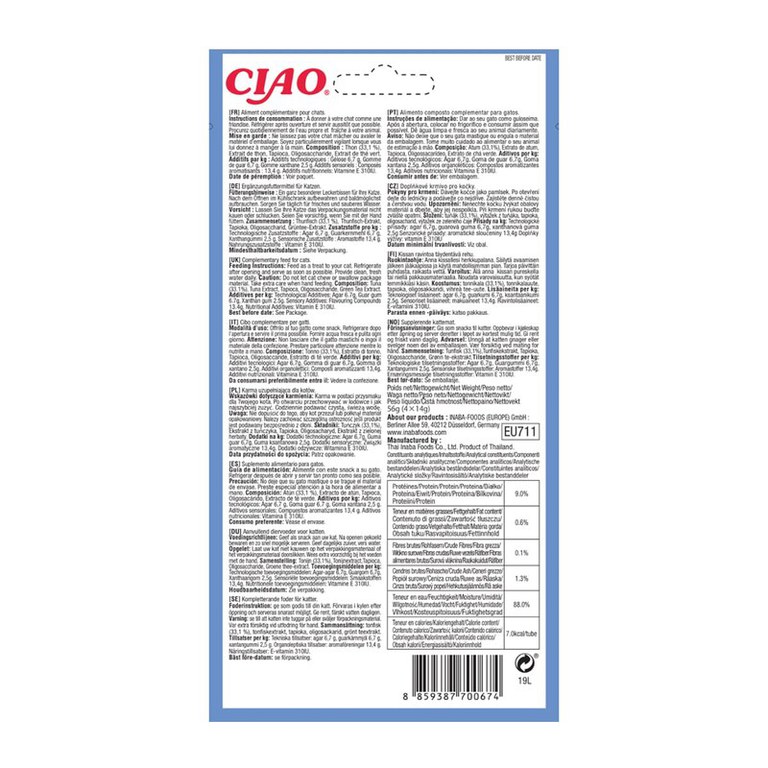 INABA CIAO Churu Pops, Ton, recompense lichide monoproteice fără cereale pisici, topping pate, 15g x 4