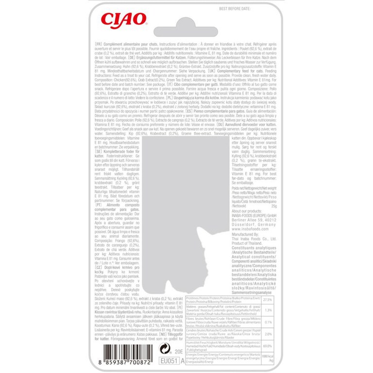 INABA Ciao Fillet, Pui și Creveți, plic recompense fără cereale pisici, (în sos), 25g