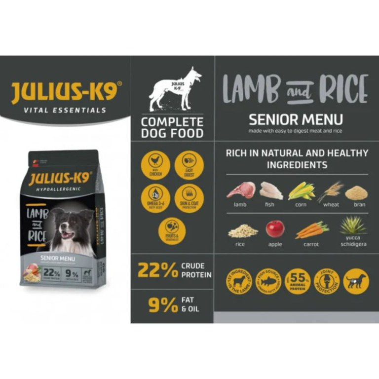 JULIUS-K9 Hypoallergenic Senior Menu, XS-XL, Miel și Orez, hrană uscată câini senior, alergii, 3kg