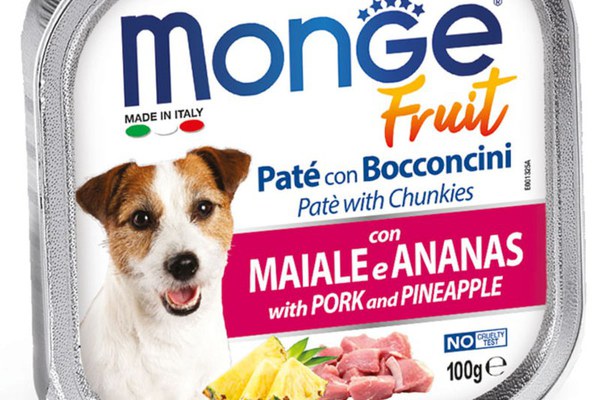 MONGE Fruit, XS-XL, Porc și Ananas, tăviță hrană umedă fără cereale câini, (în suc propriu), 100g