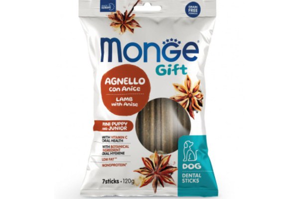 MONGE Gift Puppy&Junior Mini Dental Sticks, XS-S, Miel și Anason, punguță recompense funcționale fără cereale câini junior, 120g