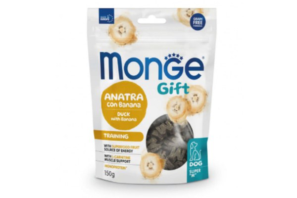 MONGE Gift Super M Training, XS-XL, Rață și Banane, punguță recompense funcționale fără cereale câini, 150g