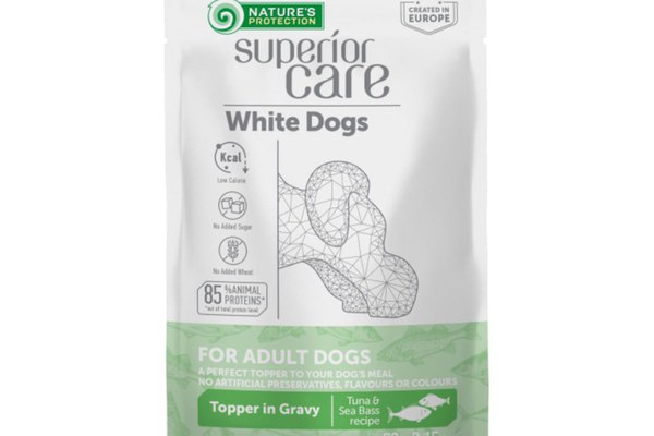 NATURES PROTECTION Superior Care White Dogs, XS-XL, Ton și Pește alb, plic hrană umedă câini, (topping), 70g