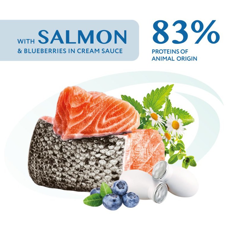 OPTIMEAL cu somon si afine in sos delicios si cremos este o hrană umedă special concepută pentru caini. Hrana furnizează cainelui proteine de înalta calitate, care sunt importante pentru menținerea masei musculare. Un amestec optim de fibre solubile și insolubile contribuie la o funcție digestivă normală. Hrana Optimeal include toți nutrienții și substanțele vitale și este astfel potrivită pentru dieta zilnică. Beneficii: <ul><li> Conținut ridicat de apă purificată pentru mentinerea unei bune hidratari. </li><li> Carne proaspătă de iepure - proteine de origine animala de înaltă calitate, ușor digerabile, mentine digestia sănătoasă </li><li> Conține complex Immunity Support Mix, plante , fructe de pădure și prebiotice </li><li> Omega-3 și 6, zinc, biotină - ajută la menținerea pielii sănătoase și blanii stralucitoare </li></ul> Specificații: BrandOPTIMEALSpecieCainiCalitate HranaSuper-PremiumMonoproteicNuAromaSomonMetoda de preparareIn SosAmbalajPlicGreutate produs100g