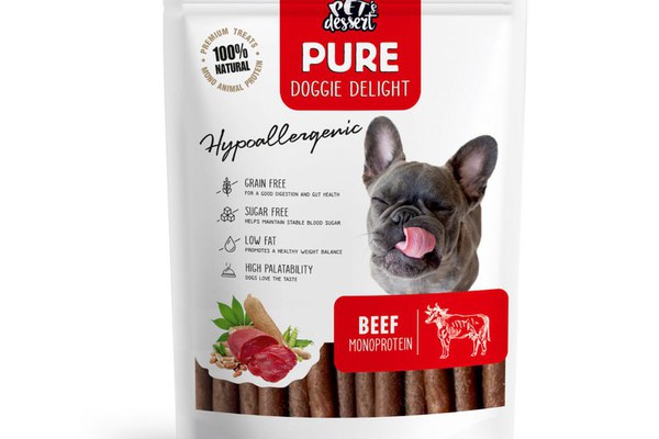 PET'S DESSERT Pure Doggie Delight Hypoallergenic, XS-XL, Vită, punguță recompense monoproteice fără cereale câini, alergii, 80g
