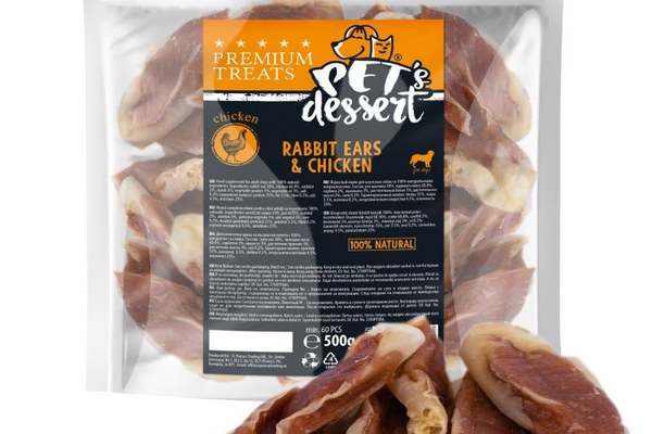 PET'S DESSERT Rabbit Ears & Chicken, XS-XL, Iepure și Pui, punguță recompense fără cereale câini, 500g