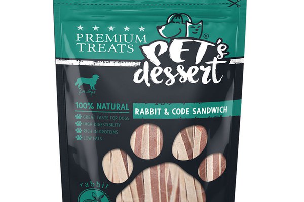 PET'S DESSERT Sandwich, XS-XL, Iepure și Cod, punguță recompense fără cereale câini, 80g