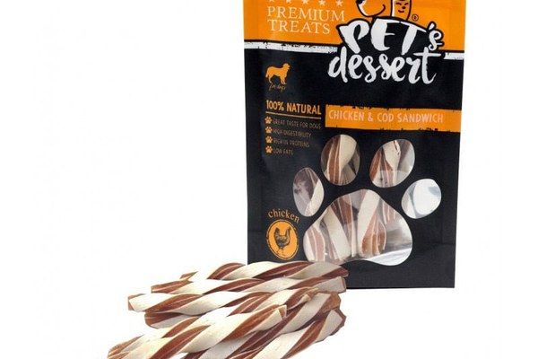 PET'S DESSERT Sandwich, XS-XL, Pui și Cod, punguță recompense fără cereale câini, 80g
