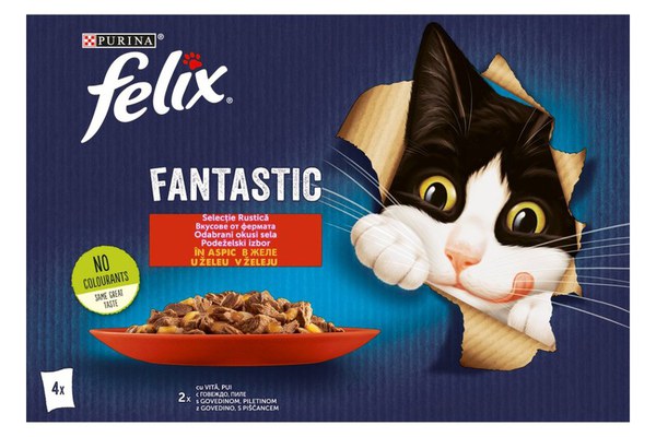 FELIX FANTASTIC este o gama de rețete irezistibile de hrană umedă care arată și miros atât de bine și au un gust atât de delicios încât sunt că o hrană pe care ai gătit -o tu însuți . Fiecare rețeta conține bucățele fragede într -un aspic suculent pentru o masă delicioasă pe care pisica o poate savura . FELIX FANTASTIC este disponibil într -o gama largă de rețete delicioase în aspic gustos, pentru a satisface dragostea pisicii tale pentru varietate în fiecare zi. Această hrană are bucățele fragede într -un aspic delicios, pentru o masă gustoasă care este la fel de gustoasă precum arată ! Special concepută pentru a satisface 100% nevoile pisicii tale. Conține surse de acizi grași esențiali Omega 6 și o combinație echilibrată de minerale și vitamine, pentru a susține vitalitatea și poftă de ghidușii a pisicii tale!
