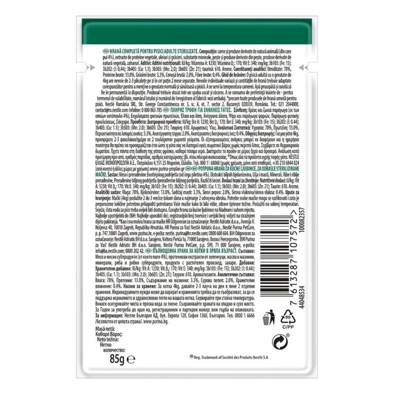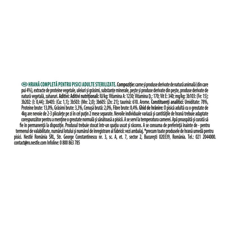 PURINA Pro Plan Sterilised Nutrisavour, Pui, hrană umedă pisici sterilizate, (în sos) PURINA Pro Plan Sterilised Nutrisavour, Pui, plic hrană umedă pisici sterilizate, (în sos), 85g