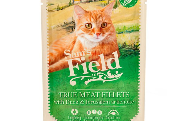 SAM'S FIELD True Meat Fillets, Rață, plic hrană umedă fără cereale pisici, (în sos), 85g