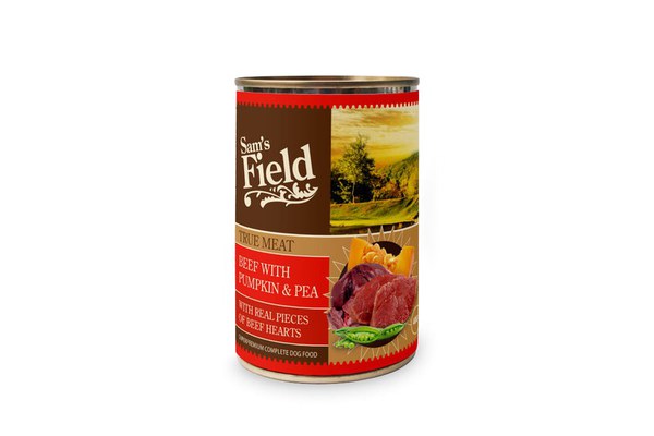 SAM'S FIELD True Meat, XS-XL, Vită și dovleac, conservă hrană umedă fără cereale câini, (în aspic), 400g