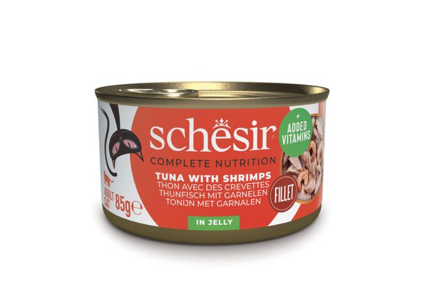 SCHESIR Complete Nutrition, Ton și Creveți, conservă hrană umedă pisici, (în aspic), 85g