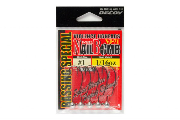 Jigurile Vj-71 Nail Bomb sunt de o calitate japoneza desavarsita, sarma este subtire pentru a permite penetrarea lejera a nalucii dar este foarte rezistenta. Curba relativ ingusta a carligului face jigul ideal pentru naluci slim sau viermi, recomandat pentru pescuitul in ape fara bradis sau vegetatie. Caracteristici: Terminal tija: Ochet; Forjate pentru extra-rezistenta; Varf ascutit chimic; Finisaj premium; Culoare: black-nickel; Tara origine: Japonia; Prezentare: 5 buc/plic.