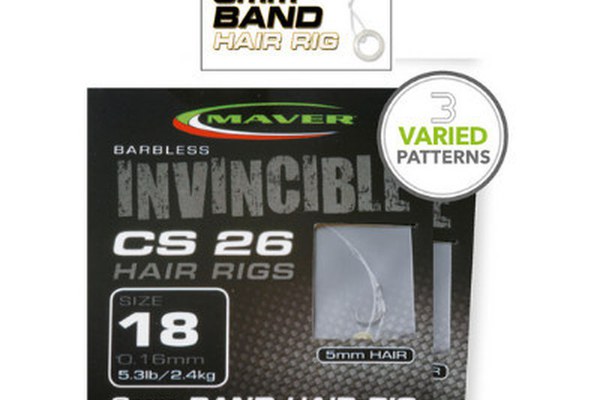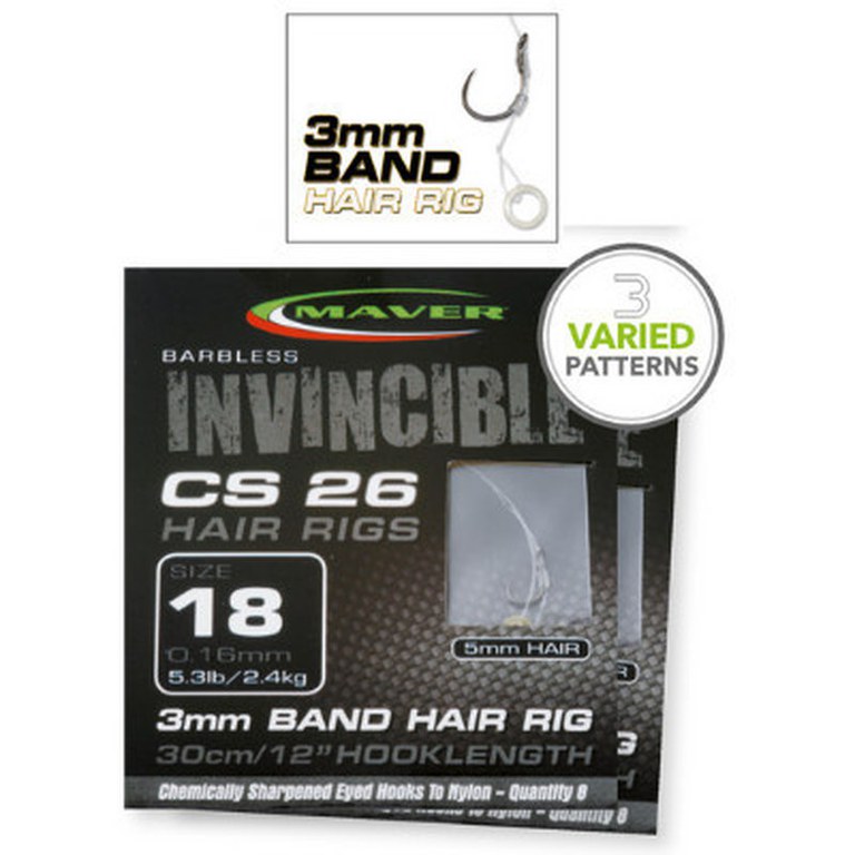 Invincible CS26 Banded de la Maver sunt carlige legate in montura fir de par, cu banda de silicon pentru fixarea momelii, sunt robuste si puternice, cu un design unic ce reduce riscul de pierdere a pestelui. Carligele sunt realizate din otel premium cu procentaj ridicat de carbon, extrem de ascutite prin procedura de ascutire chimica, cu tija dreapta, curbura wide gape si varf fara barbeta orientat in interior, cu nylon de cea mai buna calitate. Ideale in tehnicile de match si waggler. Caracteristici: Lungime: 30 cm; Lungime fir de par: 5 mm; Marime banda: 3 mm; Marime carlige: Nr. 14 - legat cu fir diametrul 0.20 mm; Nr. 16 - legat cu fir diametrul 0.18 mm. Nr. 18 - legat cu fir diametrul 0.16 mm. Mod de ambalare: 8 bc/plic.
