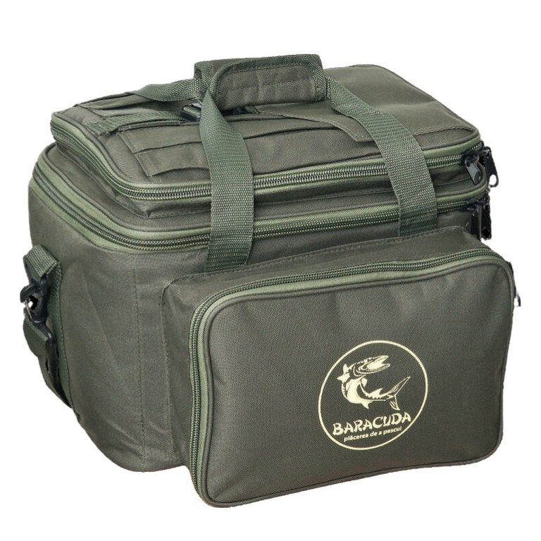 Geanta este dotata cu un compartiment mare, central, pentru toate accesoriile necesare pescuitului. Caracteristici: 1 buzunar frontal mare, incapator; 1 buzunar generos pe capac pe care se afla 1 compartiment extra pentru diverse accesorii; Curea pentru umar si doua manere; Dimensiuni: 37x33x30cm (luand in calcul si buzunarele); Material 600D Nylon; Fund impermeabil cu sistem anti-alunecare; Culoare verde-kaki.