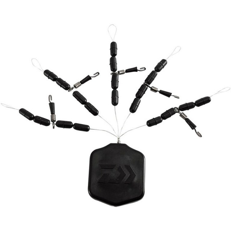 Kit-ul Daiwa N'Zon Heli se preteaza pentru realizarea monturilor de tip heli. Se poate fixa cu usurinta pe firul principal cu ajutorul opritoarelor din cauciuc. Este dotata cu cinci agrafe, ce permit schimbarea rapida. Caracteristici: Culoare: negru; Mod de ambalare: 5buc/plic.