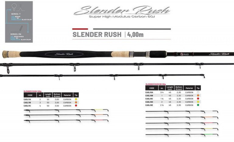 Slender Rush de la Colmic este o lanseta de feeder ce satisface toate gusturile si acopera toate nevoile pescarului de lac, balta si rauri, fiind un all-rounder de incredere. Blancul este foarte subtire , realizat din fibre de carbon Super High Modulus 60J ce ii confera o putere, rezistenta si reactivitate deosebita, fiind capabil de aruncari foarte precise gratie lungimii mari, este echipat cu inele SIC cu finisaj negru , mandrina clasica si maner elegant , ergonomic cu acoperire din pluta naturala si EVA foarte buna calitate. Caracteristici: Lungime: 400 cm; Lungime transport: 136 cm; Putere de aruncare: 120 g; Actiune: action 2; Blank: carbon super-high-modulus; Numar tronsoane: 3+3; Greutate: 290 g.
