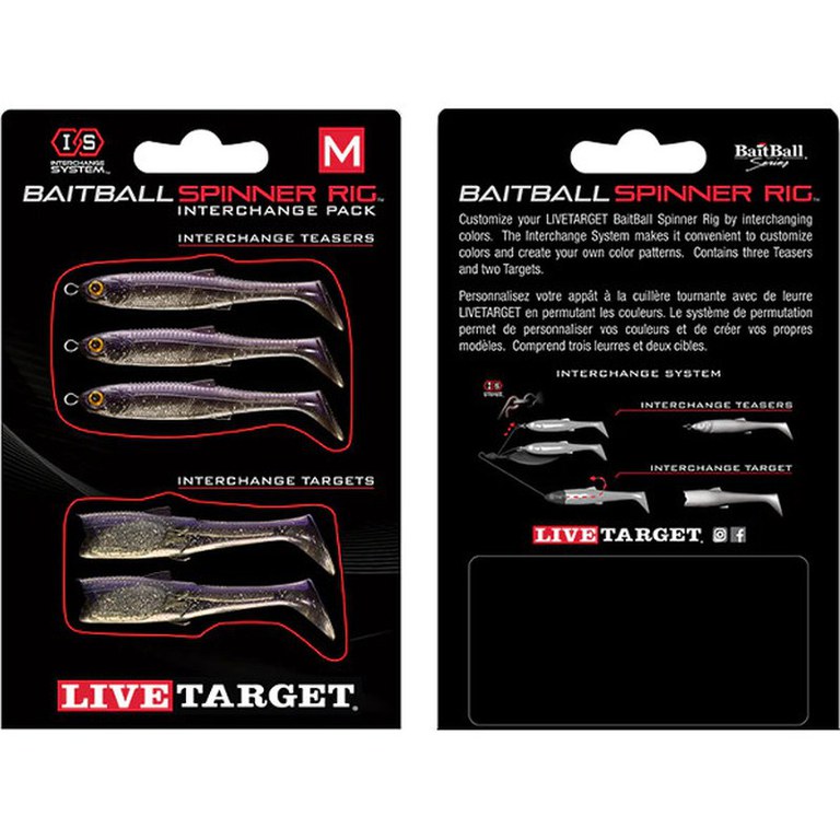 Personalizati sau reimprospatati-va BaitBall Spinner RIG LIVETARGET cu pachetul de rezerva BaitBall Spinner Rig. Aveti posibilitatea sa va creati propria combinatie de culori si modele pentru inlocuirea teaserelor si nalucii deteriorate. Fiecare pachet de schimb contine trei teasere si doua naluci principale. Selectati pachetul Interchange Sistem care se potriveste cu dimensiunea Spinner Rig, asa cum este mentionat dupa simbolul rosu al marimii indicat pe ambalaj : S, M, L. Astfel aveti asigurat ca naluca inlocuita se potriveste cu montajul original. Caracteristici: .Tip produs:Rezerva Spinnere; Model naluca: BaitBall; Ambalaj : 5 Buc; Culoare: 851 Purple Pearl-Silver.