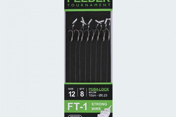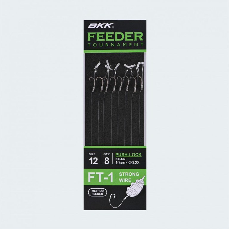 Rigurile de concurs BKK FT-1 Feeder cu ochet sunt o serie de carlige legate special concepute pentru pescuitul la feeder, dezvoltate pentru a oferi penetrare instantanee si rezistenta maxima atunci cand prindeti pesti mari la method cu, carlige mici. Fabricate cu finisajul SS,semnatura BKK, care mentine varful ascutit chiar si dupa nenumarate capturi, aceste carlige super ascutite sunt legate cu fir mono de inalta calitate, japonez si dispun de opritor quick stop (blocator rapid) care permite pastrarea momelii langa carlig si un schimb rapid al momelii. Ca tipuri de momeala recomadate putem enumera urmatoarele:porumbul, peletele, paine sau carne, mini boilies si alte momeli artificiale specifice pescuitului la method. In procesul de executie al acestui rig au fost folosite nodurile cele mai eficace si rezistente pentru aceasta destinatie, fiind testate in decursul unui an, de testeri Bkk, in diverse situatii de concurs. Majoritatea, daca nu toate marcile de pe piata, isi leaga rigurile cu un nod fara nod, care atunci cand este legat folosind nailon, se desprinde foarte usor si aluneca in stanga si in dreapta schimband intotdeauna orientarea firului de par.Pentru a rezolva aceasta problema, Bkk leaga toate dispozitivele noastre cu un nod diferit care nu se desface, mentine intotdeauna orientarea firului de par si mentine aceeasi rezistenta a nodului ca si nodul fara nod. Prezentarea corecta a momelii pe substrat si exigenta in pregatirea acestui rig tehnic ajuta enorma la partide de pescuit si concursuri reusite fara riscuri si rateuri. Caracteristici: Nr. 8 - diametru fir 0.25mm; Nr. 10 - diametru fir 0.23mm; Nr. 12 - diametru fir 0.23mm; Nr. 14 - diametru fir 0.20mm.