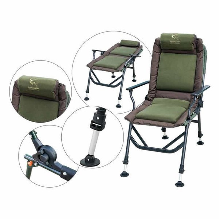 Scaun pentru pescuitul la crap cu perna fleece, spatar reglabil, cu cotiere si picioare ajustabile (înaltimea sezutului fata de pământ variază între 43cm şi 58cm) - material gros Oxford 600x300 + Fleece, cadru metalic - dimensiuni spătar (cm): 48x56 - dimensiuni șezut (cm): 48x48 - grosime șezut: 4,5cm - greutate: 7,5kg