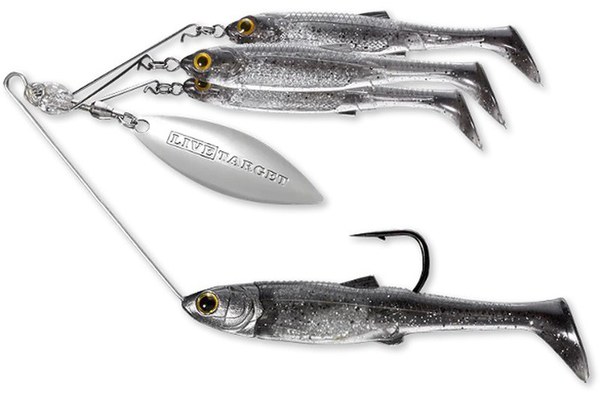 Spinnerbait Live Target BaitBall Spinner Rig Large imita un grup mic de pesti. Cele trei naluci si lama in forma de salcie creaza vibratii si efect vizual ce atrage pestii din apropiere. Designul cu cadru rigid din sarma permite nalucii sa fie trasa prin vegetatie si alte obstacole, cum ar fi copaci, structuri si piloni de andocare, in timp ce evolueaza mai adanc. Caracteristici: Tip naluca: Spinnerbait; Greutate: 14g; Design unic; Culoare: Smoke/Silver.