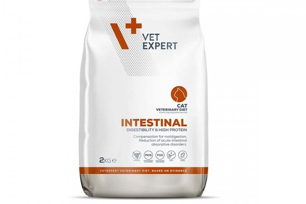 Hrana completa si dietetica dedicata pisicilor, pentru sprijinul functionarii optime a sistemului digestiv si pentru reglarea absorbtiei intestinale. Completeaza insuficientele cauzate de digestie si absorbtie slaba. Continut crescut de electroliti si ingrediente cu grad ridicat de digestibilitate si aport scazut de de grasimi.\nIndicatii: Dieta pentru caini cu intolerante digestiveHrana completa si echilibrata pentru caini, recomandata in cazuri de dreglari ale absorbtiei intestinale si ale sistemului digestiv. Echilibreaza insuficientele datorate digestiei defectuoase si malabsorbtiei.\nSpecii tinta: pisici\nDescriere:Continutul scazut de Uleiuri si Grasimi recomanda 4T VETERINARY DIET INTESTINAL CAT in tratamentul tuturor afectiunilor digestive (Afectiuni Pancreatice).Hrana contine electroliti si ingrediente cu grad de digestibilitate ridicat, alaturi de o cantitate redusa de grasimi.\nInformatii suplimentare: ATENTIE! Doar pentru uz veterinar! A nu se lasa la indemana copiilor! Respectati instructiunile de administrare.Contactati medicul veterinar inainte de folosirea sau prelungirea utilizarii acestui produs, deoarece pot aparea schimbari de dozaj sau mod de folosire in functie de simptomele individuale ale animalului. Sac 2 Kg
