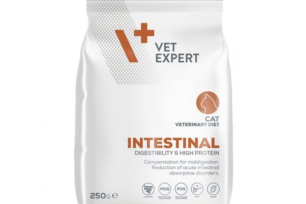 Hrana completa si dietetica dedicata pisicilor, pentru sprijinul functionarii optime a sistemului digestiv si pentru reglarea absorbtiei intestinale. Completeaza insuficientele cauzate de digestie si absorbtie slaba. Continut crescut de electroliti si ingrediente cu grad ridicat de digestibilitate si aport scazut de de grasimi.\nIndicatii: Dieta pentru caini cu intolerante digestiveHrana completa si echilibrata pentru caini, recomandata in cazuri de dreglari ale absorbtiei intestinale si ale sistemului digestiv. Echilibreaza insuficientele datorate digestiei defectuoase si malabsorbtiei.\nSpecii tinta: pisici\nDescriere:Continutul scazut de Uleiuri si Grasimi recomanda 4T VETERINARY DIET INTESTINAL CAT in tratamentul tuturor afectiunilor digestive (Afectiuni Pancreatice).Hrana contine electroliti si ingrediente cu grad de digestibilitate ridicat, alaturi de o cantitate redusa de grasimi.\nInformatii suplimentare: ATENTIE! Doar pentru uz veterinar! A nu se lasa la indemana copiilor! Respectati instructiunile de administrare.Contactati medicul veterinar inainte de folosirea sau prelungirea utilizarii acestui produs, deoarece pot aparea schimbari de dozaj sau mod de folosire in functie de simptomele individuale ale animalului. Sac 2 Kg