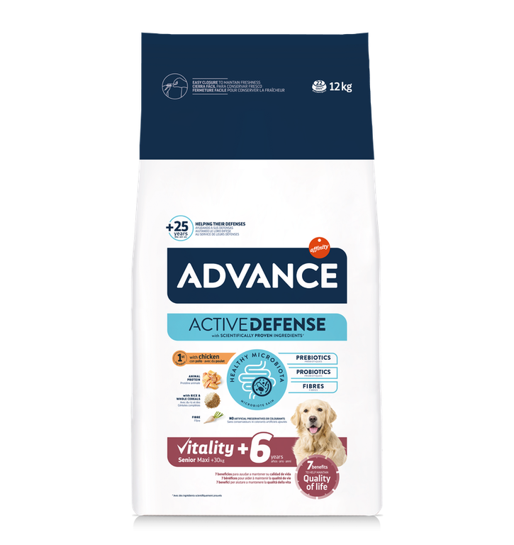 Advance Vitality Senior Maxi +6 ajută la menținerea vitalității câinilor de talie mare peste 6 ani. Le oferă 7 beneficii cheie adaptate vârstei lor pentru a le ajuta să-și mențină calitatea vieții.