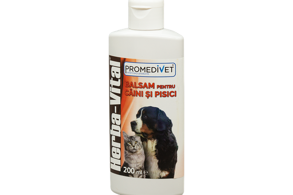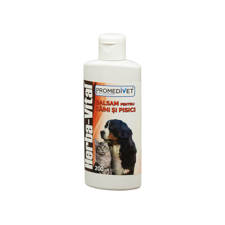 Balsam Herba Vital, 200 ml este un balsam pentru întreţinerea şi igienizarea blănii la câini şi pisici. Balsamul Herba Vital, datorită conţinutului în extracte de plante medicinale, întreţine blana animalului, are proprietăţi hidratante şi nutritive pentru epidermă şi firul de păr. Creşte rezistenţa firului de păr, blana devine mai suplă şi mai uşor de pieptănat. Parfumul din balsam are efect dezodorizant.\nCONŢINUTExtract vegetal, format din extracte de;\n\nBRUSTURE (Arctium lappa – radix)\nMESTEACĂN (Betula pendula – folium)\nCOADA CALULUI (Equisetum arvense – folium)\nNUC (Juglans regia – folium)\nMUŞEŢEL (Matricaria chamomilla – flos)\nJALEŞ DE GRĂDINĂ (Salvia officinalis -folium)\nURZICĂ (Urtica dioica – radix et folium)\n\nBalsamul mai conţine sabonal, amonix cetac, cocoamidopropil-betain, conservant, parfum, apă.\nMOD DE ADMINISTRARE\n\nUz extern, se spală blana cu un şampon, iar după clătirea şamponului se aplică şi se dispersează balsamul pe întregul corp.\nDupă 5-10 minute de acţiune, se îndepărtează prin clătire repetată cu apă caldă.\nSe usucă blana cu un prosop sau aer cald.\n\nPRECAUŢII\n\nA se evita contactul direct cu ochii şi zonele sensibile (organele genitale).\nA nu se lăsa la îndemâna copiilor.\nA nu se înghiţi.\nA nu se refolosi flaconul după golire.\n\nPĂSTRARE\n\nSe păstrează în ambalaje bine închise, ferit de surse de foc, soare şi umezeală, la temperatura camerei (15-25 C˚)