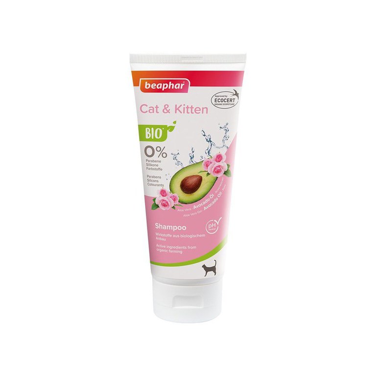 Șamponul Beaphar Cat & Kitten conține gel de aloe vera din agricultura ecologică, pentru a hidrata pielea și a lăsa blana moale.\n\nEticheta Ecocert garantează originea naturală a ingredientelor folosite.\n Șamponul este îmbogățit cu ulei de avocado și trandafir, lăsând astfel blana moale și strălucitoare.\n Ph-ul său neutru respectă natura pielii pisicii sau pisoiului.