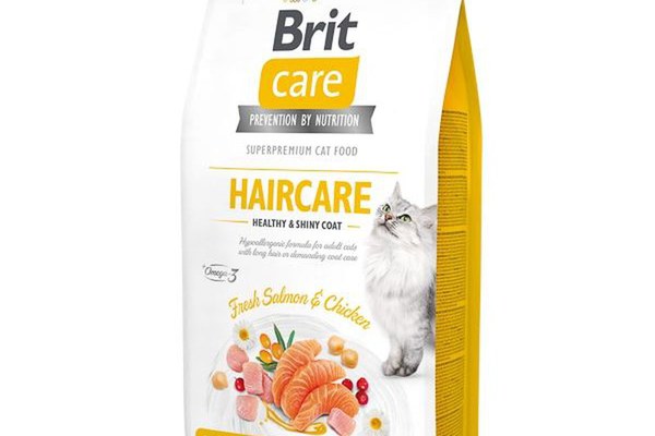Brit Care Cat GF Haircare Healthy and Shiny Coat, 2 kg este o mancare de calitate superpremium pentru o ingrijire atenta a blanii.\n\nBrit Care Cat GF Haircare Healthy and Shiny Coat, 2 kg este o hrana uscata pentru pisicile de interior, cu o formula hipoalergenica fara cereale bogata in fibre care faciliteaza trecerea bilelor de par. Proteinele din carne de inalta calitate ajuta la mentinerea muschilor puternici. In combinatie cu taurina, un nutrient esential pentru pisici, sustine sanatatea inimii.\n\nBeneficii Brit Care Cat GF Haircare Healthy and Shiny Coat, 2 kg:\n• Somon proaspat, Pui, Seminte de In – surse naturale de acizi grasi omega-3 si omega-6 care ajuta la mentinerea unui strat stralucitor si a pielii sanatoase.\n• Probioticele si Prebioticele ajuta la mentinerea sanatatii tractului gastro-intestinal si a sistemului imunitar.\n• Fibre – ingredientele bogate in fibre faciliteaza trecerea bilelor de par. Fibrele brute ofera o senzatie de satietate, ceea ce duce la un aport redus de alimente si ajuta la reglarea greutatii corporale.\n• Fara cereale – Fara coloranti – Fara conservanti – Fara OMG – Fara soia.