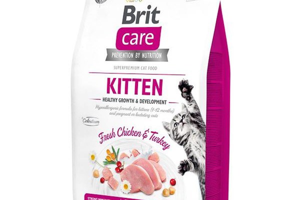 Brit Care Cat Kitten Healthy Growth and Development, 2 kg este o hrana uscata pentru puii de pisica sau pentru pisicile gestante sau care alapteaza.\n\nO formulă hipoalergenică, fără cereale și usor digerabilă, bogată în substanțe nutritive esențiale, pentru a satisface cerințele energetice ale pisicilor gestante sau care alăptează și pentru a sprijini dezvoltarea fetală corespunzătoare. Conținutul echilibrat de calciu, fosfor, magneziu, vitamina D și un complex de vitamine, minerale și acizi grași esențiali asigură o dezvoltare sanatoasa a pisoilor și ajută la prevenirea rahitismului.\n\nBeneficii Hrana pisici junioare Brit Care Cat Kitten Healthy Growth and Development, 2 kg:\n\n- Probioticele și Prebioticele ajută la menținerea sănătății tractului gastro-intestinal și a sistemului imunitar.\n- Colostrum conține imunoglobuline, anticorpi care ajută pisoii să construiască o imunitate puternică.\n- Taurina susține sănătatea ochilor și a inimii.\n- Continutul ridicat de proteine ajută la menținerea creșterii și dezvoltării masei musculare.\n- Fără cereale - FĂRĂ coloranți - FĂRĂ conservanți - FĂRĂ OMG - FĂRĂ soia.