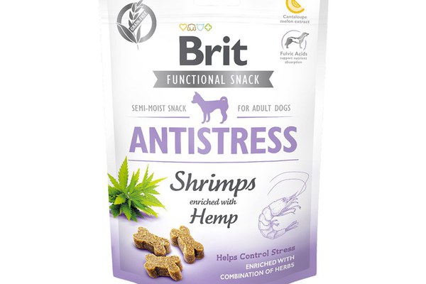 Brit Care Dog Snack Antistress Shrimps, 150 g - Recompense din carne semi-moi, fara cereale, cu efect calmant, pentru cainii adulti de toate rasele.\n\nUn tratament functional sanatos, suculent si gustos, fara cereale si cartofi.\nImbogatit in vitamina C si lactobacillus acidophilus pentru a sprijini imunitatea.\nCrevetii sunt o sursa bogata de acizi grasi omega 3 si vitamina B12, care sunt importanti pentru buna functionare a creierului si a sistemului cardiovascular.\nCanepa ajuta la armonizarea proceselor de baza in organism, sustine apararea naturala, are efecte de vindecare si linistitoare care promoveaza regenerarea profunda, digestia adecvata si confortul fizic general.\nExtractul de zahar din pepene galben ajuta la protejarea organismului impotriva radicalilor liberi.\nA adaugat prebiotice pentru mentinerea microflorei intestinale sanatoase.\nDovleacul este o mare sursa de fibre care ajuta la facilitarea trecerii alimentelor prin tractul digestiv.\nColagenul ajuta la stimularea cresterii celulelor cartilaginoase si regenereaza sistemul locomotor.\nAcidul fulvic creste activitatea sistemului imunitar, sustine absorbtia nutrientilor din alimente, stabilizeaza microflora intestinala, are efecte antibacteriene si antiinflamatorii.