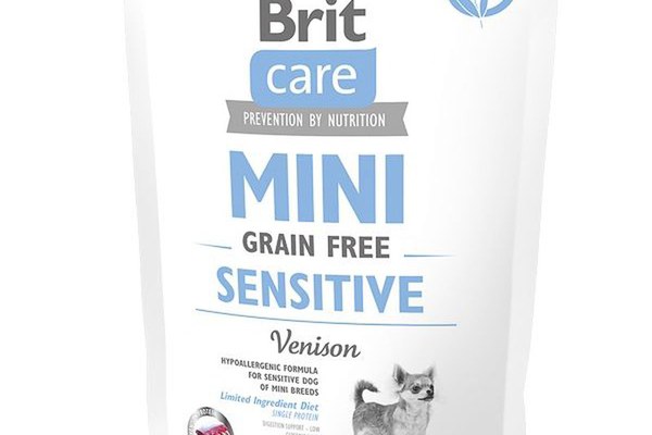Brit Care Mini Grain Free Sensitive, 400 g este o hrana uscata premium pentru caini adulti de talie mica sau talie pitica cu sensibilitate digestiva sau predispusi la alergii. Formula nutritionala cu vanat (caprioara), fara adaos de cereale, este usor digerabila si asigura echilibrul nutritional al cainilor de talie mica.\n\nAdaosul de acizi grasi omega-3 si omega-6 asigura o piele sanatoasa si o blanita stralucitoare.\nForma, textura si dimensiunea crochetei, atenuaza depunerile de tartru cu efect benefic in mentinerea sanatatii cavitatii bucale.\nBrit Care Mini Grain Free Sensitive nu contine cereale, conservanti sau coloranti artificiali.